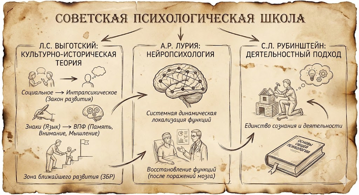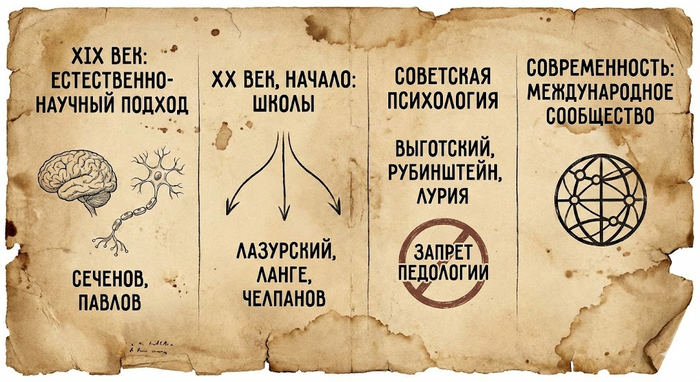 Российская психология имеет долгую и сложную историю. Её основы в XIX веке заложили такие учёные, как Сеченов и Павлов, изучавшие психику с позиций естествознания. В начале XX века возникли первые психологические школы (Лазурский, Ланге, Челпанов). Советский период был противоречивым: с одной стороны, это время выдающихся научных школ (Выготского, Рубинштейна, Лурии), а с другой — период идеологического контроля, когда целые направления (как педология) запрещались. Но главное, что современная российская психология, опираясь на это наследие, активно развивается в русле мировой науки!