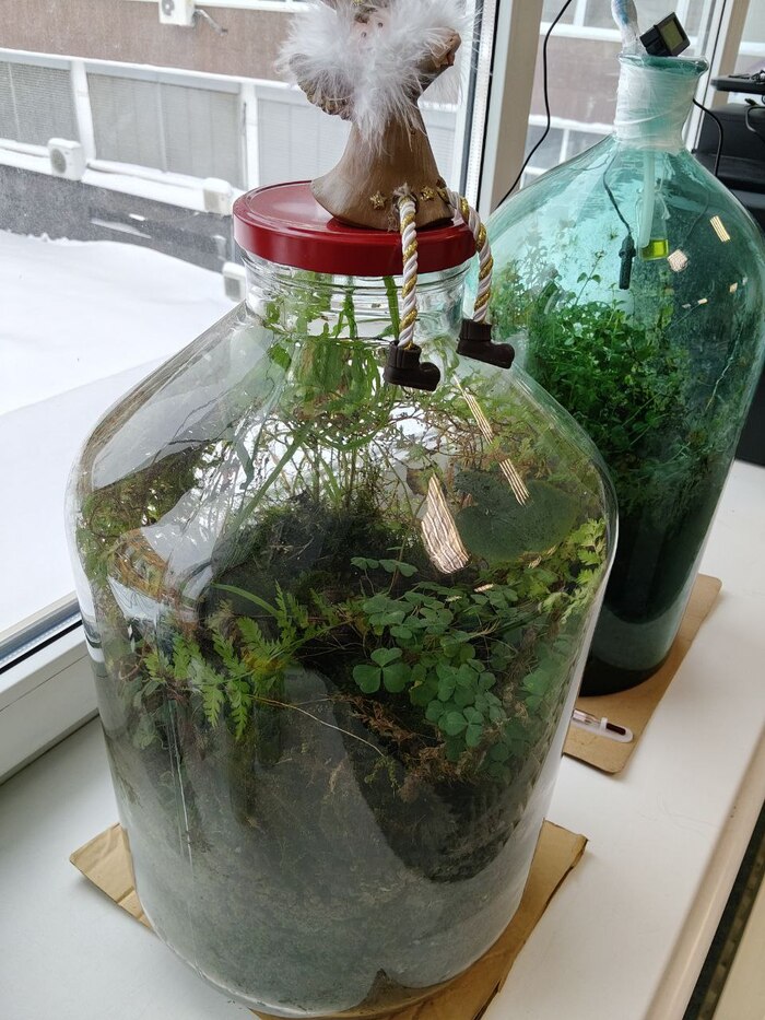 Около года назад, в 2016 году, я увидела в Интернете статью и видеоролик про замечательного садовода и экспериментатора Дэвида Латимера. В них рассказывалось о том, что Дэвид Латимер в свои молодые годы увлекался популярной тогда тенденцией – садами в банках (бутылках). Многие из его друзей выращивали удивительные сады в закупоренных стеклянных емкостях. На просторах Интернета об этом повествуется зачастую на примитивном уровне «посадил дед репку, выросла репка большая-пребольшая». Довольно наивно, не правда ли? Понятно, что все было гораздо более сложно, чем с репкой. Ведь Дэвид Латимер проводил эксперимент, и добился-таки результата путем проб и ошибок. Что же удалось этому гениальному садоводу? Он создал полностью закупоренный автономный сад в большой стеклянной банке (насколько мне известно, в 30-литровой банке из-под кислоты), которому на сегодняшний день около 50-ти лет. В качестве сада в бутылке растет неприхотливое растение традесканция. Как я уже говорила, это был тернистый путь проб и ошибок. Дэвид Латимер садил разные растения, в том числе и хлорофитум, которые не приживались во влажной и ограниченной среде банки. Некоторые в закупоренном состоянии погибали через год-два. И только один из нескольких ростков традесканции смог выжить до сего дня и разрастись, создав реально автономную и самодостаточную замкнутую систему. Латимер поворачивает свое творение к свету разными боками, передвигая по дому, и это приносит ему огромное удовольствие. Мне, конечно, далеко до Латимера, но сама идея кажется мне очень увлекательной. Особо подчеркну, что Вечный Флорариум – это не Декоративный Флорариум. И разница в этих понятиях огромна. Декоративный Флорариум создается именно для красоты, декора и интерьера. Он выполняется с использованием декоративных аксессуаров – цветного стекла, камней и песка, дополнительных композиций в виде домиков, насекомых, водопадиков и прочего. Для Декоративного Флорариума используются стеклянные выдувные емкости в виде полуоткрытых капель, сфер, кувшинов, сообщающихся сосудов. Либо такие Флорариумы садятся в стеклянные многогранники, которые легко заказать в сети Интернет. Все эти Флорариумы являются либо открытыми, либо полуоткрытыми (растения садятся на стеклянную подставку типа блюда, которое накрывается стеклянной крышкой-колоколом). Смысл всего этого в том, что если растения разрастутся, покроются плесенью, гнилью, либо переувлажнятся – их легко можно будет подрезать, подлечить, заменить или вообще выкинуть. С Вечным Флорариумом все совсем по-другому. Вечный Флорариум создается именно для исследовательских и экспериментаторских целей, поэтому он не может и не должен быть красив. Вечный Флорариум, как внешне, так и внутренне, поистине уникален, и на его создание требуется много практических навыков и запас времени. Как раз год назад, увидев статью про Дэвида Латимера, я обнаружила 10-литровую стеклянную банку у моей родственницы, и мне пришла в голову идея повторить эксперимент Латимера. Сразу скажу, что на сегодняшний день моему Вечному Флорариуму уже 11-й месяц, а по факту 12-й месяц. Это значит, что 1 месяц он проходил инкубационный период, а 10 месяцев он находится в состоянии полной изоляции от воздуха и полива (закупорен). Второму моему Флорариуму 2 месяца по факту (1 месяц в инкубации, и 1 месяц 
