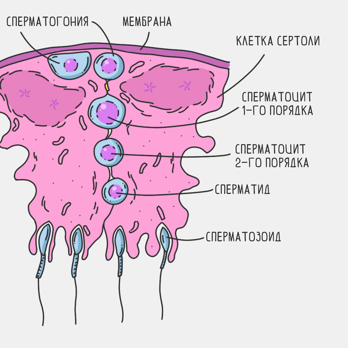 Так вот. Есть сперматогонии, которые сидят себе спокойно на стенках канальцев. И постоянно делятся. После первого деления у нас получается две сперматогонии. Одна из них как бы возвращается обратно, чтобы восполнить ресурс для будущего деления. А вторая продвигается дальше, чтобы продолжить развитие. Она подрастает и теперь уже называется сперматоцитом первого порядка. Затем еще одно деление и получаются два сперматоцита второго порядка. Затем еще одно деление — и у нас четыре сперматида. Постепенно из них формируются сперматозоиды, отпочковываются от сперматид и уплывают в свободное плавание. В результате из одной сперматогонии получается четыре сперматозоида.