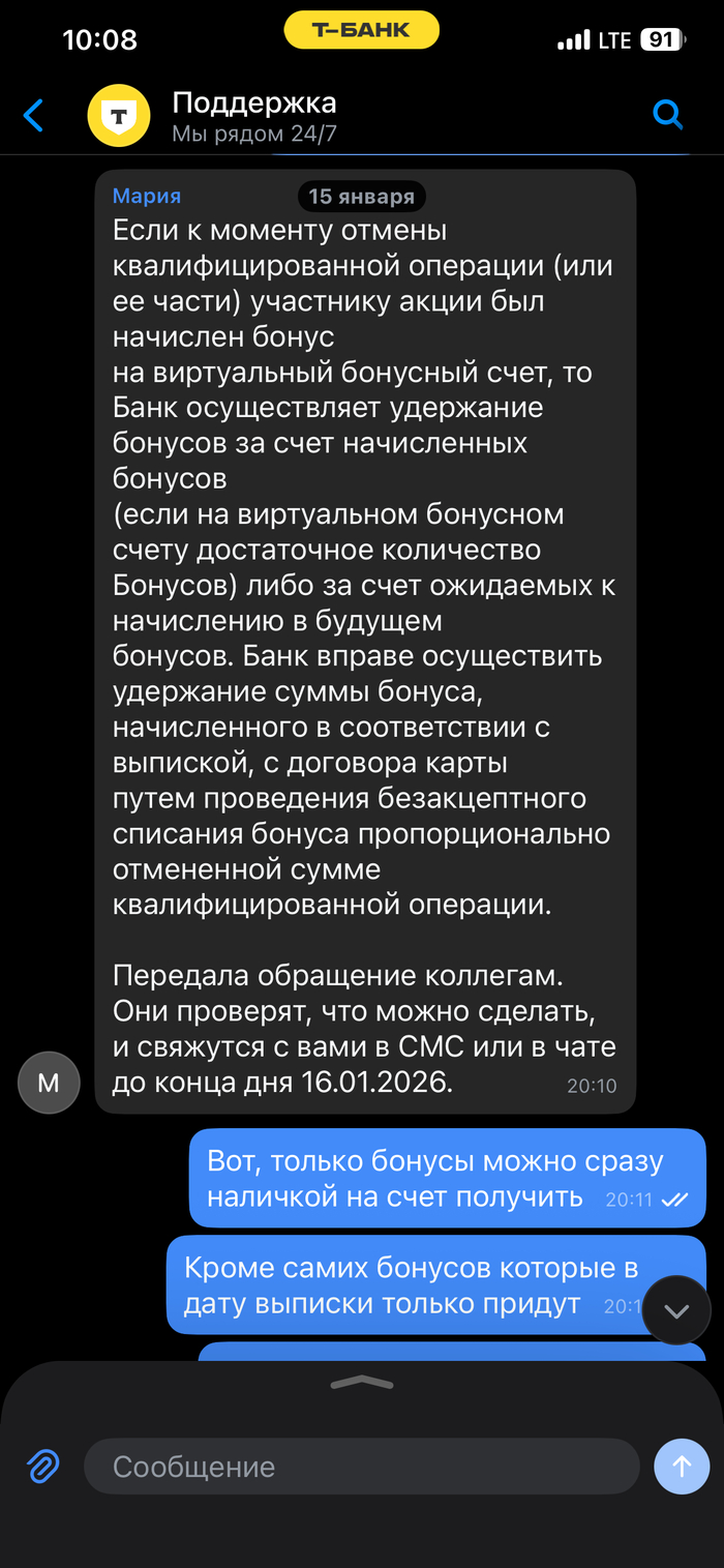 История начинается с 18.01.2026 - именно в этот день должна была состояться первая доставка продукции АО «Т-Банк» в период с 18:00 до 20:00. Простояв на морозе приблизительно пол часа, я до последней минуты верил и надеялся, что представитель банка приедет, и начнется процесс получения продуктов, ведь я звонил 3 раза и написал в чате. Однако, этого не последовало, а на мой звонок в банк с целью выяснить, где находится представитель — оператор сообщила, что не смогла связаться, и якобы оформила жалобу, пообещав предоставить ответ до 22.01.2026 включительно.