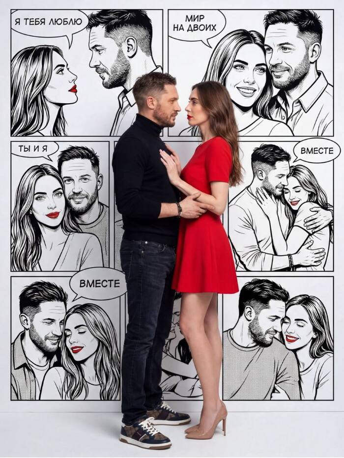 Использовать загруженные фотографии как ЕДИНСТВЕННЫЕ референсы лица и внешности персонажей. Строго сохранить идентичность, черты лица и пропорции. Фотореалистичная студийная fashion-съёмка в полный рост. В кадре пара влюблённых - женщина и мужчина, стоят близко друг к другу, ощущение притяжения и близости. Образы: - женщина - современный эффектный look: короткое платье, каблуки, акцент на красную помаду; - мужчина - чёрная водолазка, джинсы, минималистичный современный стиль. Образы гармонируют, пара выглядит как fashion-пара. Фон: чёрно-белый комикс ко Дню влюблённых с панелями одной и той же пары в разных состояниях: взгляд друг на друга, улыбка, близость, тихое счастье. Графические элементы и надписи: «Я ТЕБЯ ЛЮБЛЮ», «МИР НА ДВОИХ», «ТЫ И Я», «ВМЕСТЕ». Пара фотореалистичная, цветная, чётко отделена от иллюстрированного фона эффект «живых людей внутри комикса». Мягкий студийный свет, естественная кожа, высокий фотореализм. Вертикальный формат, эстетика fashion + роp art + Valentine's editorial. Без CGI, без мультяшности.