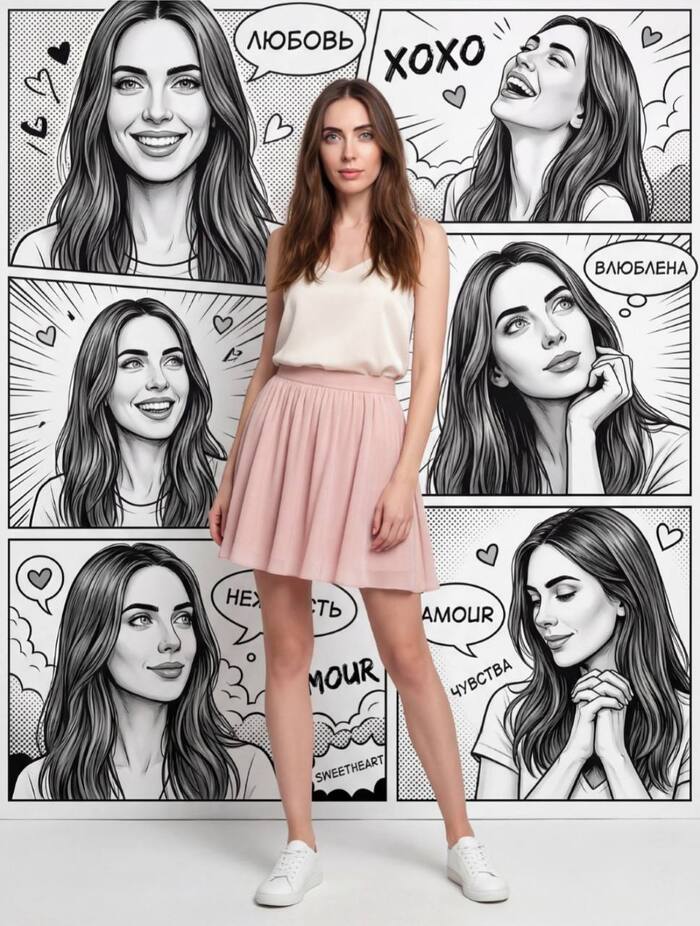 Использовать моё загруженное фото как ЕДИНСТВЕННЫЙ референс лица и внешности. Фотореалистичная студийная fashion-съёмка в полный рост. Женщина по центру кадра, лёгкая расслабленная поза, мягкая уверенная подача. Образ: романтичный casual - короткая юбка, светлый базовый топ, белые кеды. Цвета мягкие: молочный, айвори, пудрово-розовый, светло-голубой. Образ нежный, женственный, современный. Фон: чёрно-белый комикс ко Дню влюблённых с панелями одной женщины в разных состояниях: улыбка, смех, мечтательность, влюблённость. Графические элементы и надписи: «ЛЮБОВЬ», «ХОХО», «ВЛЮБЛЕНА», «НЕЖНОСТЬ», «ЧУВСТВА». Женщина фотореалистичная, цветная, чётко отделена от иллюстрированного фона - эффект «живого человека в комиксе». Мягкий студийный свет, естественная кожа, высокий фотореализм. Вертикальный формат, эстетика fashion + роp art + Valentine's editorial. Без CGI, без мультяшности.