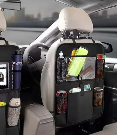 Несколько карманов подходят для хранения бутылок, игрушек, салфеток и других дорожных мелочей. Защитное покрытие спинки сиденья помогает сохранить салон в аккуратном состоянии. Такой органайзер подходит семьям и пользователям, которые часто перевозят пассажиров на заднем ряду.