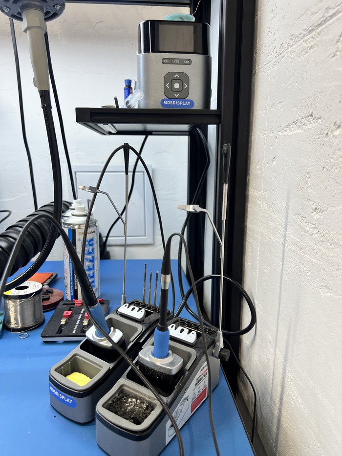Отвёртки, многопортовый блок зарядки, емкости для химии, кисточки, лопатки, скальпели, жала, припои, флюсы, пасты, трафареты, скотчи, ножницы, очистители, химия и прочая мелочёвка. Вроде бы ерунда, но по итогу набегает приличная сумма. Примерно 50 000 - 70 000 ₽