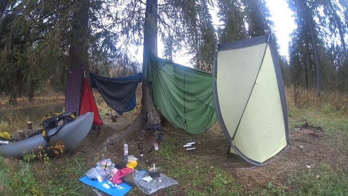 Быстро ставлю палатку, стараясь лучше и ровнее растянуть тент, лодку подтаскиваю вплотную, параллельно стенке, и вот уже у меня есть пол, потолок и стены, мягкая постель, свет и тепло, а так же горячий ужин. Благодаря ассортименту заготовок, он каждый раз разный и не приедается.