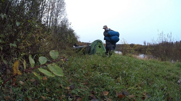 Выбираю место еще засветло, ближе к кустам, заканчиваю установку палатки уже в темноте. Туда же подтаскиваю лодку. Как оказывается, очень вовремя, так как уже начинается дождь.