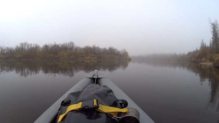 Начинает сгущаться туман, верхушки елок слегка расплываются на фоне неба, а далеко ниже по течению туман лежит на берегу неподвижной густой массой.