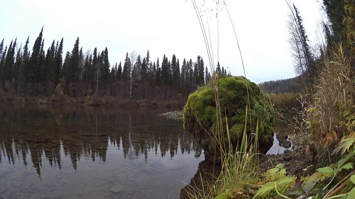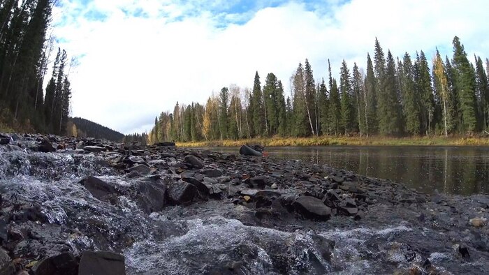 Встречаются крупные камни, ручьи с прозрачной водой голубоватого оттенка, которая не смешивается с речной, вытесняя муть и образуя небольшие заливы. Трава и мох в местах впадения ручьев радуют глаз более ярким зеленым цветом.