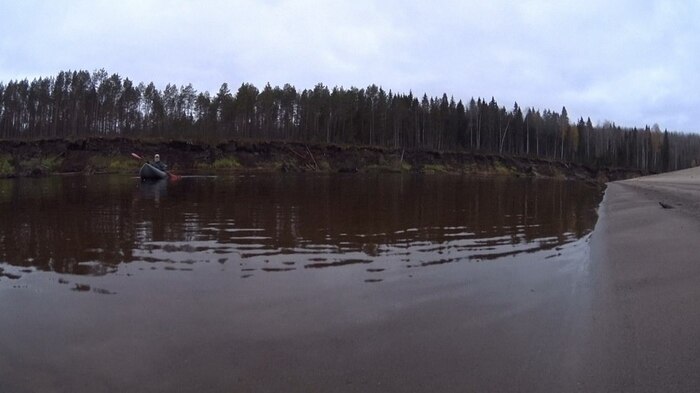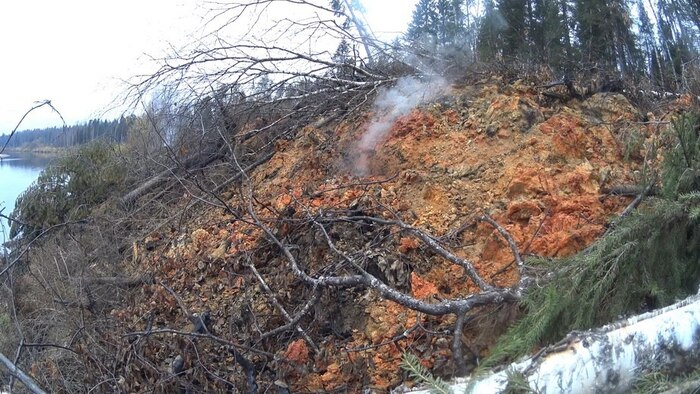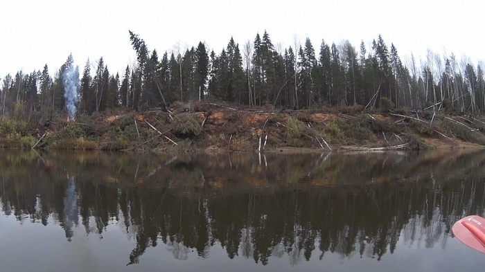 Двигаясь дальше, замечаю на обрывистом правом берегу узкий столб дыма. Поначалу думаю на рыбаков, но затем замечаю ниже еще несколько слабых источников белого дыма и постепенно разгорающееся открытое пламя. Все деревья по краю обрыва повалены в сторону реки, а сам берег имеет необычный желто-бурый оттенок, напоминающий цвет опилок, но откуда им здесь взяться в таком количестве?