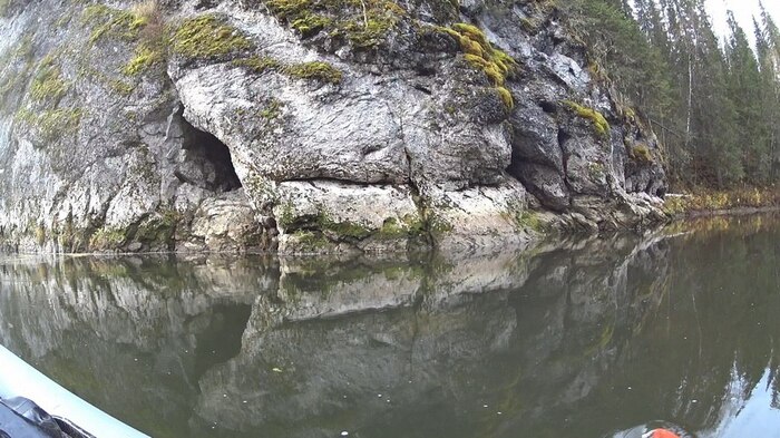 Поначалу ничего впечатляющего по берегам не встречается, обычная лесная речка, один раз, еще до дождя, слева была замечена поднимающаяся из воды серая каменная стенка.