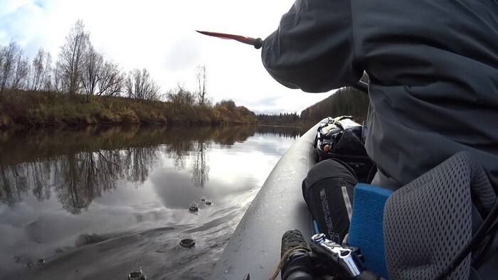 Лодка хорошо набирает скорость, без приложения усилий держится в районе 6-7 км/ч. Глубина часто меняется, и вместе с ней скорость течения, местами на мелководье набираю 8-10 км/с, чиркая килем по дну. Изредка встречаются участки с подводными камнями, заметными по бурунам за ними, стоячими волнами, которые я обхожу, и мелкой толчеёй, на которой лодка начинает шлёпать днищем. Перекаты слышны издалека, кажется, начинаю различать звук воды, текущей по камням, и шума потока от упавшего в реку дерева. Самое сложное на перекатах – угадать, как идти, чтобы не сесть на мель. Сантиметров около тридцати мне достаточно, но не везде есть и они.