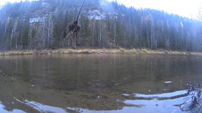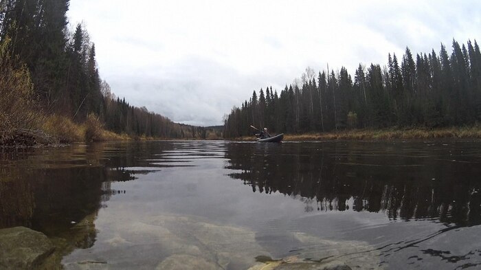 …Первый перекат привносит некоторое разнообразие ровным шумом воды и видом близкого каменистого дна, которое пролетает под тобой с неплохой такой скоростью, что особенно заметно на контрасте с кажущейся неподвижной из-за своей прозрачности водой и неспешно проплывающими берегами. Мелкий участок прохожу удачно, что пробуждает бодрый оптимизм, но дальше меня опять накрывает.