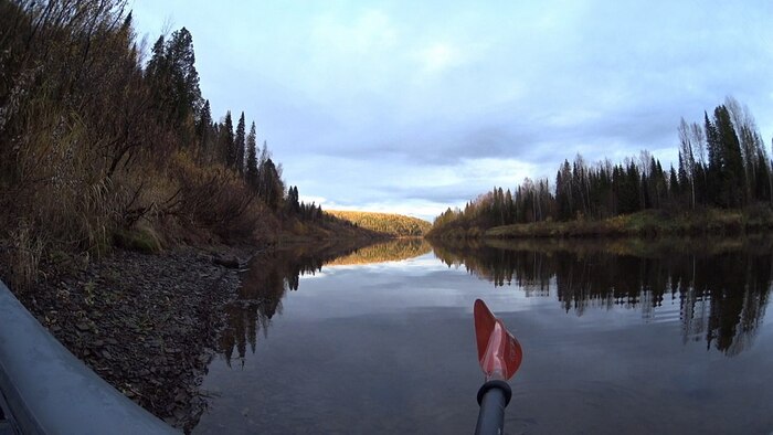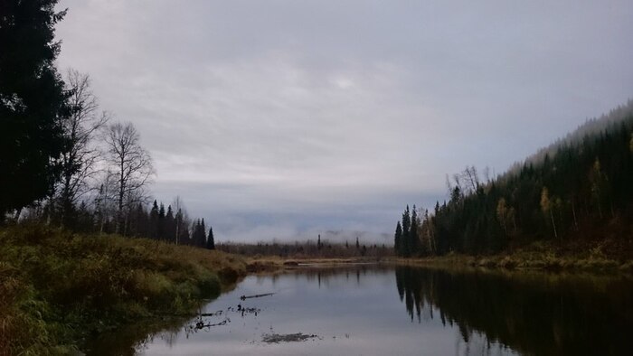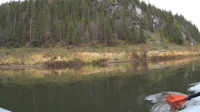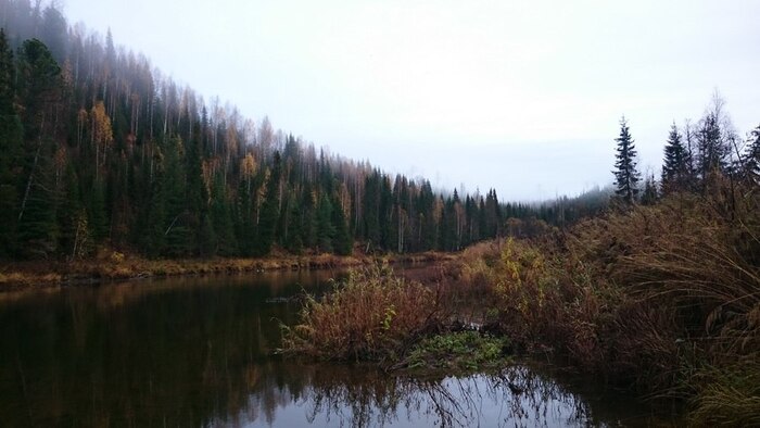 Лес здесь, в верховьях, красив и радует глаз, хвойные лапы раскидисты, верхушки причудливы. Упавшие и нависающие деревья встречаются редко, завалов нет, на берегах попадаются поваленные и обглоданные бобрами до белизны стволы. Березы стоят уже почти все без листьев, но много кустарника, который еще держится, разбавляя темный фон елей и кедров красным и желтым цветом. Впрочем, не менее часто встречаются участки унылого вида, заросшие непролазным ивняком.