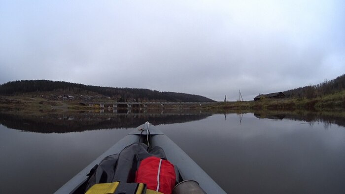 Рыбаки кого-то удят с моста и выше, переговариваясь бормотанием. Разбираю прицеп и велосипед, отмываю грязь, собираю и накачиваю лодку. Приехали – на клапане надувного сиденья отломилась верхняя пимпочка, вместе с поворотным фиксатором и прижимной пружинкой, естественно, не накачивается. Пробую перевернуть, чтобы клапан упал на гнездо – получается, прижимает давлением, держит. Лодка длиной 3,8 метров, умещается всё, надо только решить, где будет нос, где корма. Раму байка привязываю сзади, колеса сверху. Между рамой и сидушкой лодки рюкзак, как упор для спины. Упором для ног служит прицеп с гермосумкой, который размещаю в носу, и затем окончательно накачиваю баллоны.