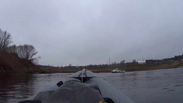 Русло относительно прямое, и лишь в районе Вижаихи делает размашистую петлю. В Вижаихе действует переправа, ходит небольшой катер с пассажирским отсеком, который как раз совершает рейс порожняком перед моим проходом.