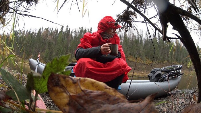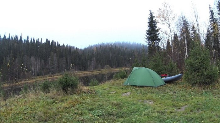 Через час я замерз, через два замерз по настоящему. Небо затянуло, серые клочья ползли и ползли над головой, дождь долбил и долбил, временами усиливаясь, но со знанием дела не переходя в ливень. Непромокаемое пончо, хотя и не пропускает воду, но то ли понемногу травит, то ли собирает конденсат – но довольно быстро на внутренней поверхности образуются капли. Лесовозы проползли обратно. Через три часа сидения я решил, что начинать движение сегодня уже не имеет смысла, перекатил велосипед дальше в лес и поставил палатку. Эпизод не героический – но, что было, то было.