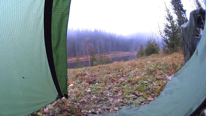 Холодно, полтора градуса, донимает конденсат. Оболочка спальника в районе ног и груди сыровата, но пух пока раздувается и греет без заметного снижения качества.