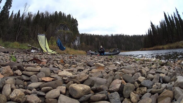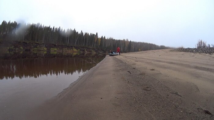 Обедаю на узкой полосе гравия под невысоким обрывом, сидя на борту лодки. Слушаю ветер, однообразный шум дождя, позвякивая титановой ложкой по дну алюминиевого котелка.
