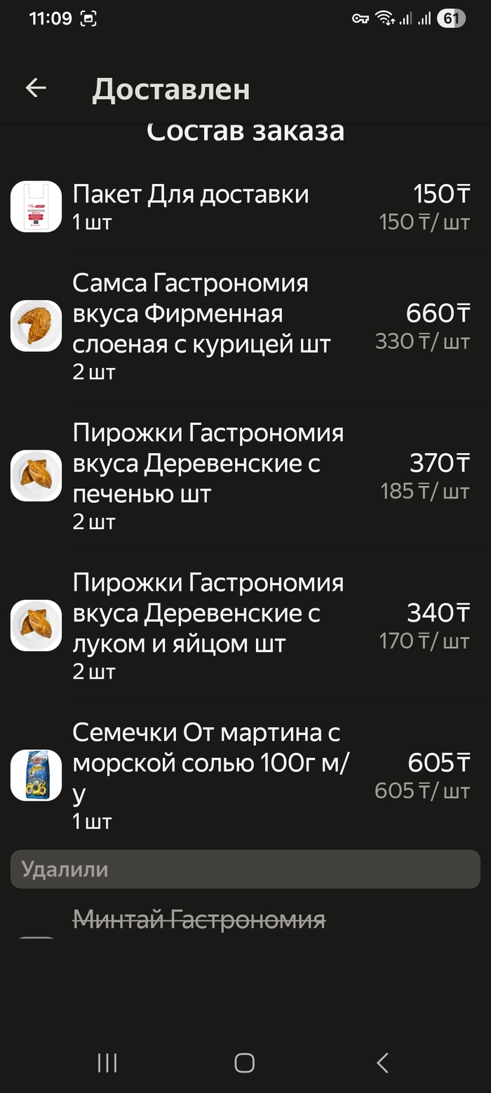 Собственно состав заказа, как мы видим, жареный минтай, имеет львиную долю цены заказа, остальное по мелочи..
