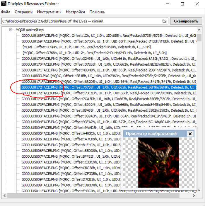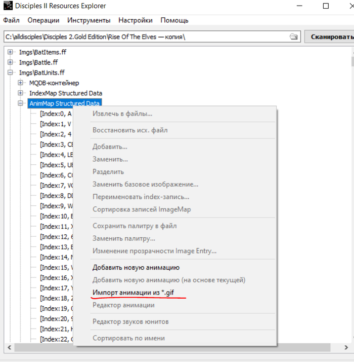 В 4 части урока по моддингу я показывал программу D2ResExplorer v2.10, которая нам понадобиться для работы с анимациями, поэтому её качаем обязательно. Указываем путь к игре, сканируем папку и открываем контейнер BatUnits.ff. В идеале ищем статичкую "анимацию" паралича юнита, что состоит из одного кадра.