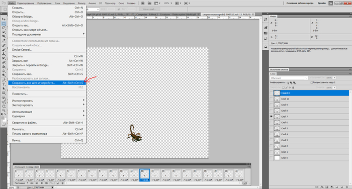 Далле нам нужно сохранить для web устройств. Это и будет сохранение в gif формате.