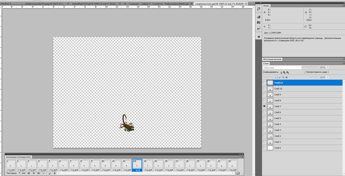 В общем пригодится, что угодно. Я решил попробовать импортировать радскорпиона из fallout 2 со второго источника. Там есть вот такая картинка со всеми кадрами каждой анимации: