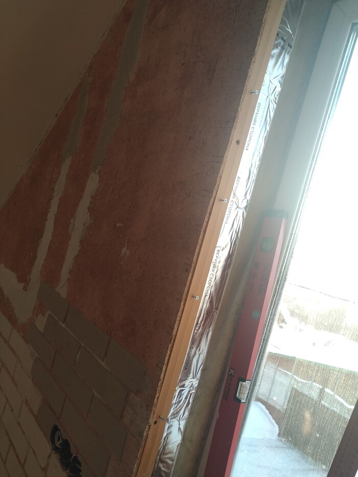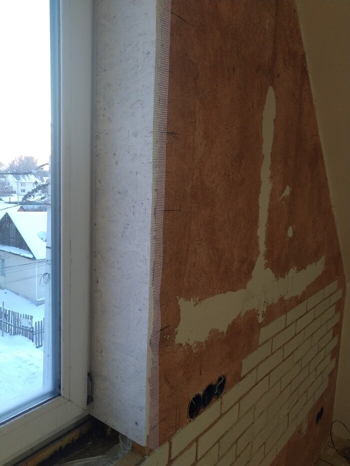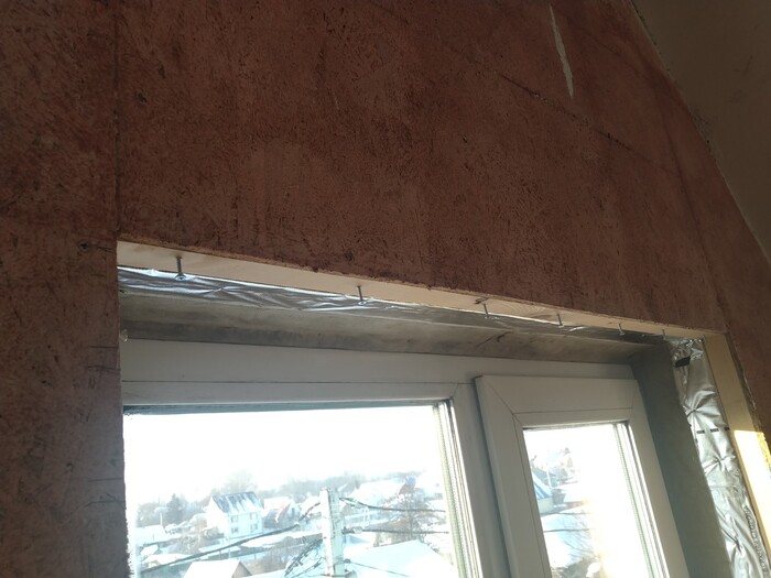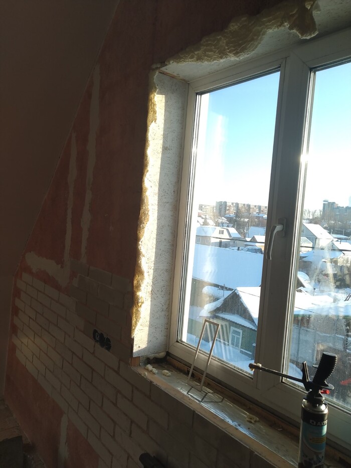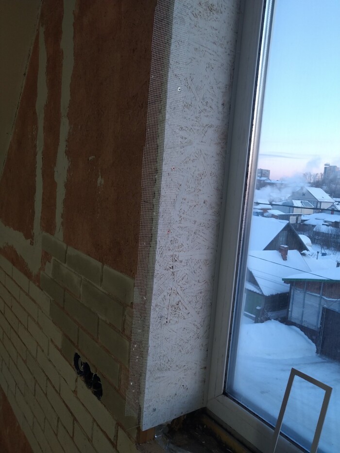 Сначала откосы, на само окно закрепил пластиковый П-образный профиль. "Разворот" делать не стал, у меня будет имитация кирпичей жэ :)