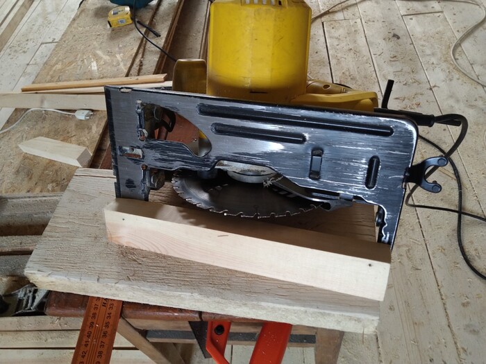 Потом я вспомнил (до покраски потолка), что мне на балках свет нужен. Мартышка + стамеска.