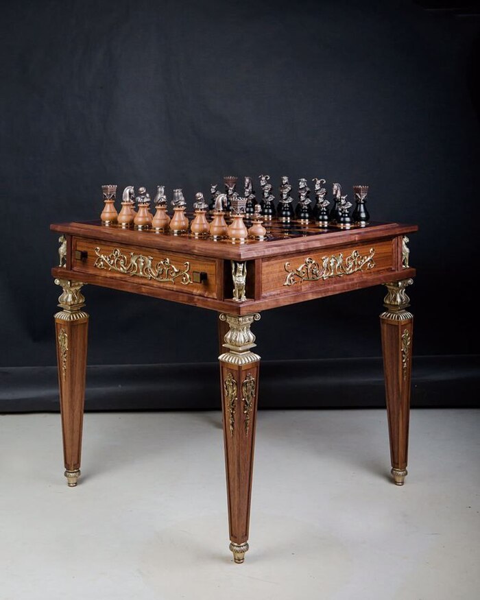 Наш мастер Олег Логунов создал это первое изделие из американского ореха и граба, а элементы из бронзы отлил. Сейчас этот стол служит учебным пособием и примером для наших учеников в Артели мастеров.