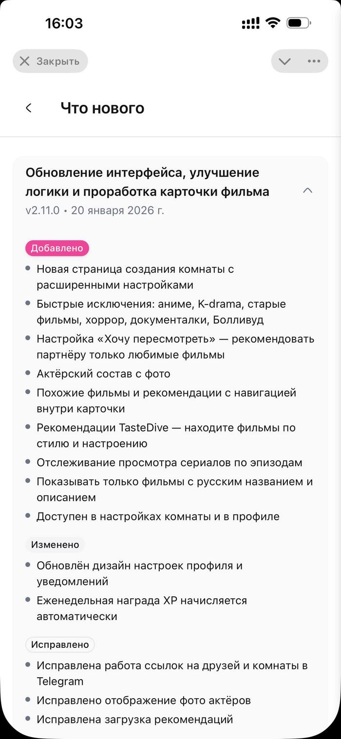 Открываешь в браузере или сразу в телеге (это мини-апп, ничего качать не надо). Создаёшь комнату, скидываешь ссылку или показываешь QR-код. Выбираете фильмы и сериалы, все что лайкните будет сохраняться в профиле, что лайкните оба -- будет вашим выбором на вечер. Готово)